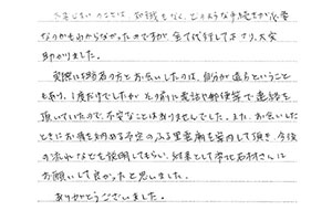 役所手続きなどいろいろ大変そうだな、と思っておりましたが全て代行していただき簡単に終わりました。