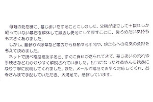 お墓を自分の代で片付けてしまうことの迷いがありましたが、終わってみてすっきりとした気持ちになりました。ありがとうございます。