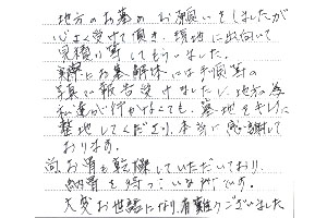 実際にお墓解体には手順等の写真で報告受けましたし、地方の為、私達が行かなくても、墓地をキレイに整地してくださり、本当に感謝しております。